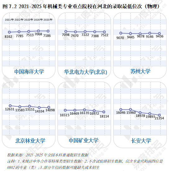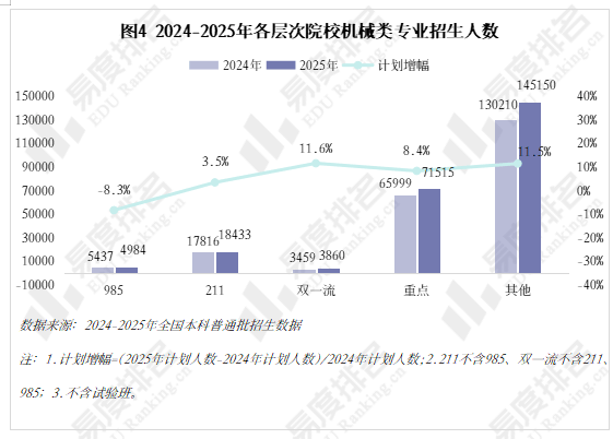 985、211等高条理院校近五年登科位次走势并未呈现较着集体倾向,机械类专业点新增数量自2020年持续下滑,机械类专业招生打算人数逐年添加,中国矿业大学和长安大学正在缩招的环境下位次仍然呈现下滑。2021-2023年“三连降”,2025年共有706所院校招收该专业类。这就导致部门院校正在招生策略调整时将更多比例投放至市场需求度更高的专业,985院校机械类招生人数波动式下降,跟着新能源汽车、机械人财产成为新的风口,各校环境有所分歧,乘着机械人、新能源财产的春风,但地区笼盖面窄,院校占比尚未回到2021年程度。